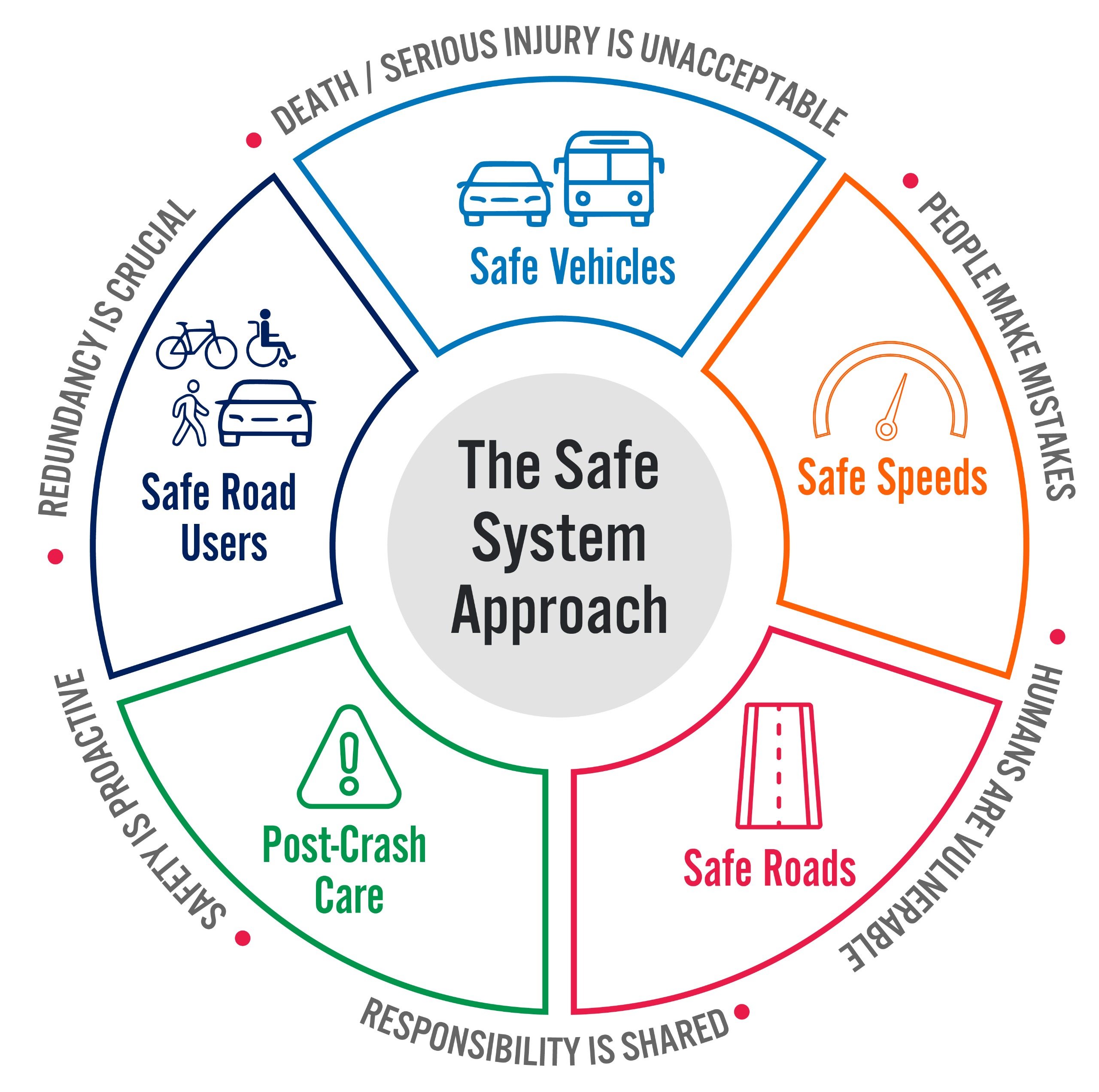 Objectives of the Safe System Approach include safer people, safer roads, safer vehicles, safer speeds and post-crash care.